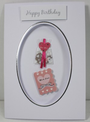Handmade Penblwydd Priodas Hapus card with 2 pearl hearts on the front.
