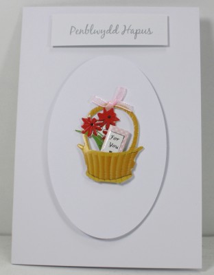 Handmade Penblwydd Hapus card in white with a basket of flowers.